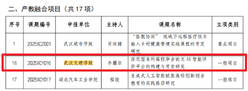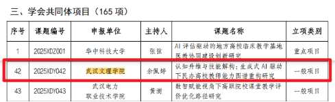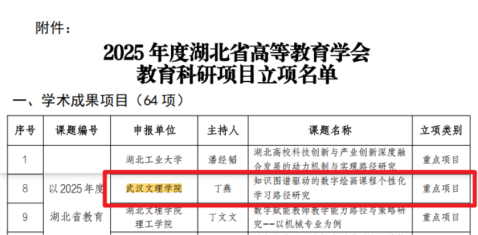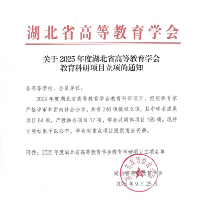 近日,湖北省高等教育学会正式公布2025年度教育科研课题立项名单,武汉文理学院5项课题成功获批。其中,学术成果项目重点项目1项、产教融合项目一般项目1项、学会共同体项目一般项目3项。相较于往年,本年度课题立项实现“数量增长、质量拔高”的双向进阶,充分彰显学校教科研实力的稳步提升。